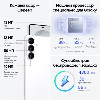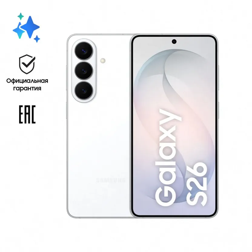 6.3" Смартфон Samsung Galaxy S26 256 ГБ белый [ядер - 10x(3.8 ГГц), 12 ГБ, 2 SIM, Dynamic AMOLED 2X, 2340x1080, камера 50+12+10 Мп, NFC, 5G, 4G, GPS, 4300 мА*ч]