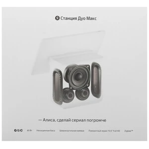 Акустическая система с 4 широкополосными динамиками и сабвуфером мощностью 60 Вт воспроизводит сбалансированный звук. Яндекс.Станция Дуо Макс YNDX-00055BLK поддерживает беспроводные технологии Wi-Fi, Zigbee и Bluetooth. Голосовой помощник Алиса работает с нейросетью YandexGPT. Она способна удерживать контекст из разговора и задавать вопросы, если необходимо уточнение. С помощью Алисы можно включать музыку, слушать сказки, заказывать продукты, вызывать такси, ставить будильник. Мультимедийный контент из сервисов Яндекс, Букмейт, Кинопоиск доступен при активной подписке Плюс.